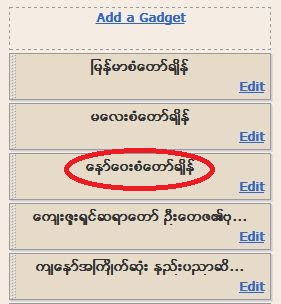 ဘေလာ့ Design ကေန Add a Gadget , ကိုဖြင့္ HTML/javaScript ထဲမွာ Paste နဲ႔